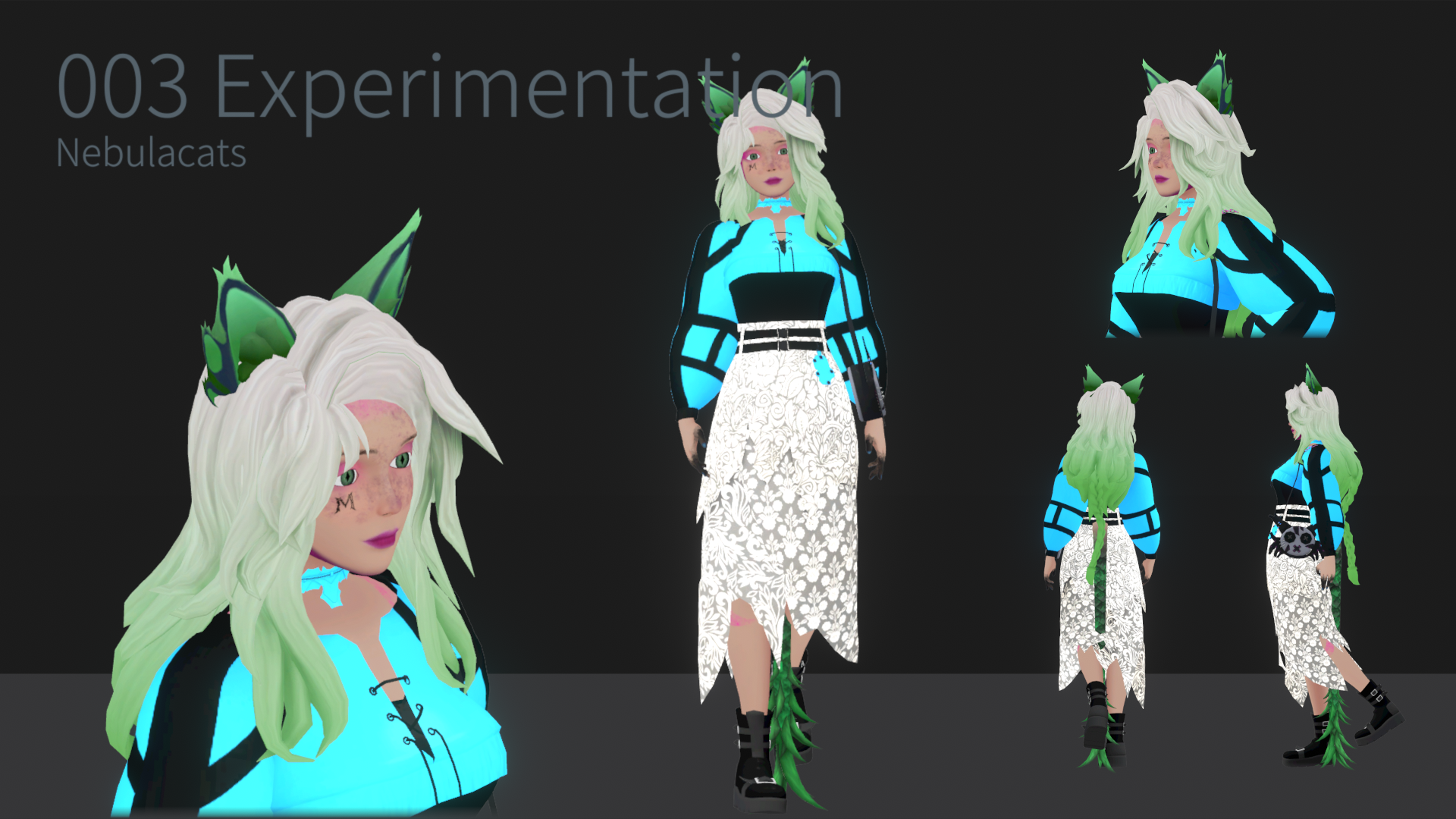 L’avatar 003 Experimentation porte un hoodie dragon, un sac dragon auquel est accroché le porte-clé Cyber, une jupe elfique et des bottes noires, chaque vêtement de l’avatar à la possibilité de changer de couleurs pour correspondre aux options des modèles réels. Vous pouvez également enlever certains accessoires ou les ajouter pour une composition de style qui vous correspond. La peau de l’avatar est couverte de rayures roses, possède des yeux vert perçant, une queue de dragon et une paire d’oreille poilu, Le corps de l’avatar à la possibilité de se féminiser ou se masculiniser.