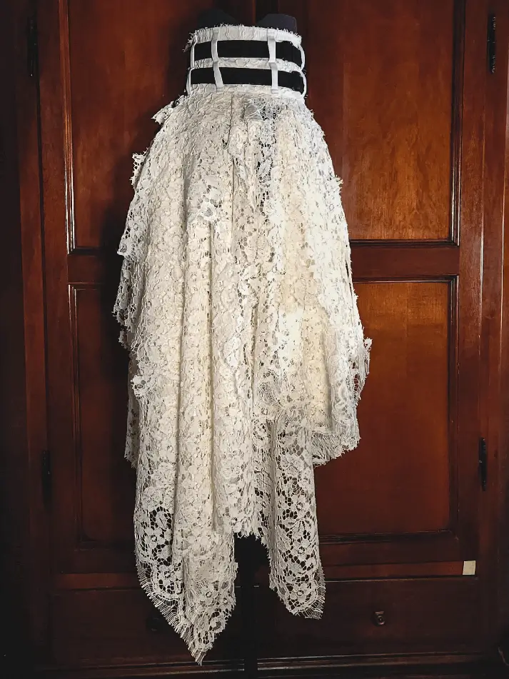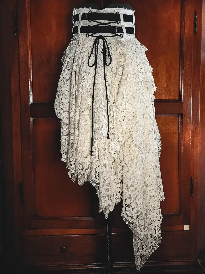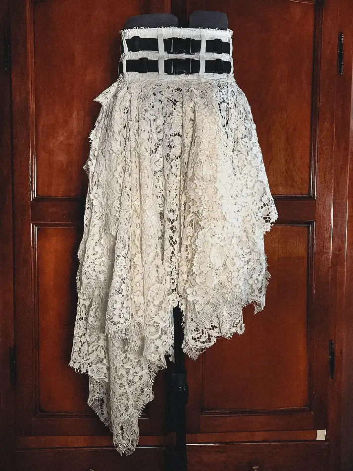 • Description : Jupe en dentelle issus de stock dormant de maison de luxe, ceinture en cuir récupérés et doublure réalisé à partir de chemise déstocker, la jupe est asymétrique et légèrement transparente, la taille est ajustable garce au laçage arrière et aux boucles, confection artisanale en Suisse, Attention le design peut présenter de légère variation dû aux matières récupérés. La dentelle présente sur la photo peut également être différentes selon les rouleaux utilisés. N’hésitez pas à nous demander une photo de la dentelle par mail si vous voulez voir exactement les modèles disponibles.