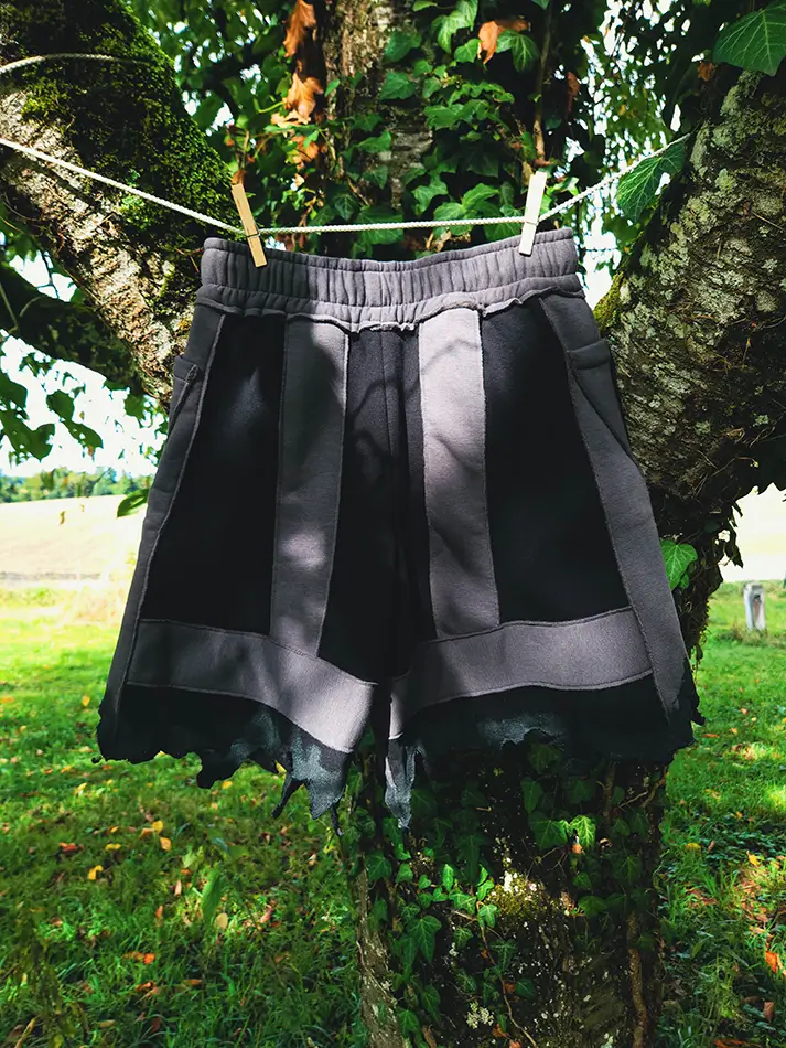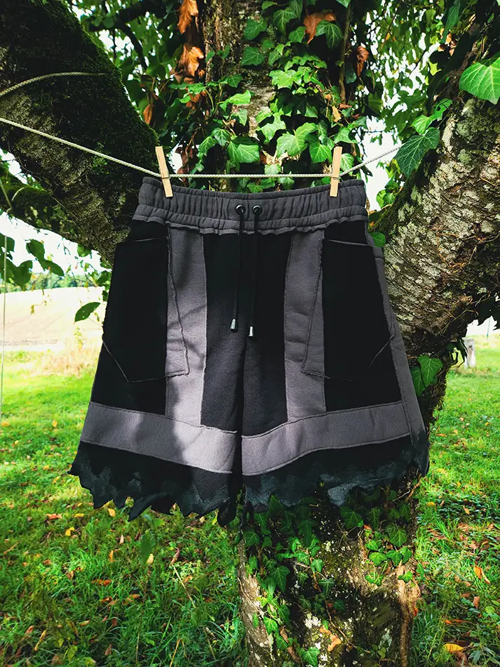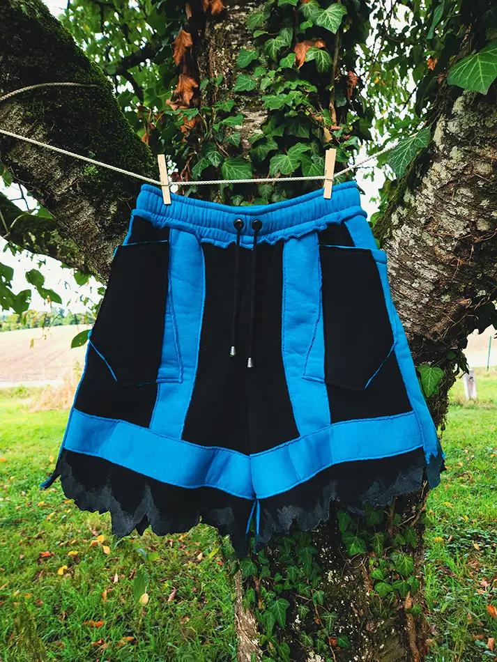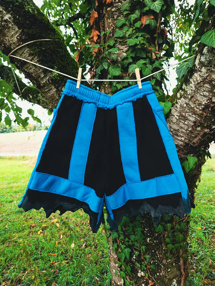 Description : Short unisexe noir en sweat épais doux, avec ligne bleues grises, finition en latex naturel, poches avant, ceinture avec élastique et cordon pour ajuster la taille, confection artisanale en Suisse, Attention le design peut présenter de légère variation dû aux matières récupérés